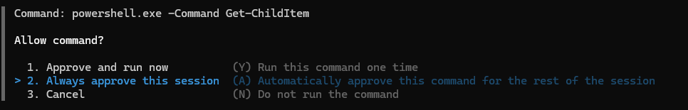 ▌ > 2. Always approve this session (A) Automatically approve this command for the rest of the session