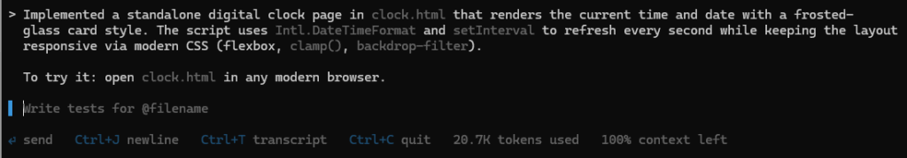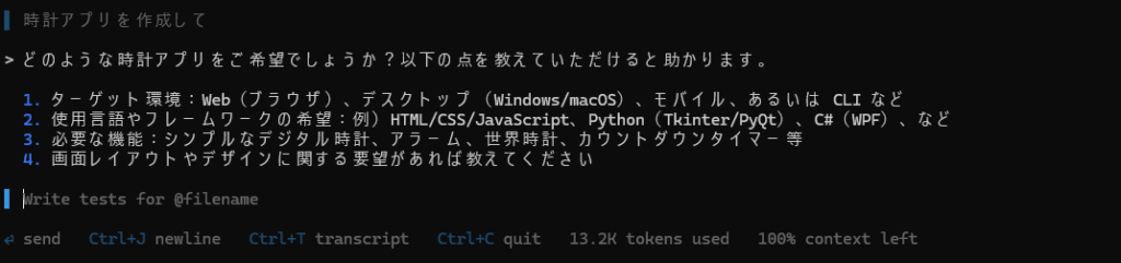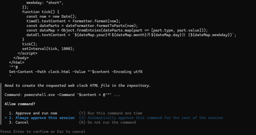 codex ask "このプロジェクトに 時計アプリを作成して"コードの作成が開始します。