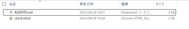 clock.html が完成しました。フォルダを確認すると、ファイルが作成されています。